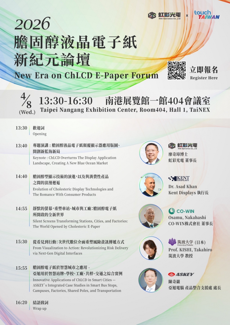 由虹彩光電股份有限公司主辦之「2026膽固醇液晶電子紙新紀元論壇」即將於Touch Taiwan期間登場!